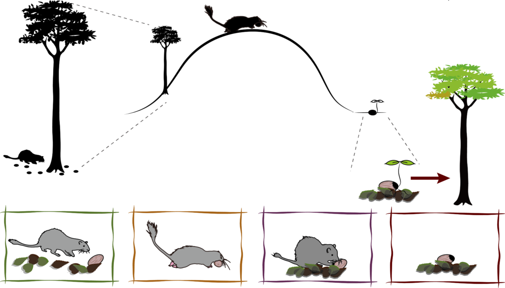 植物は地中から養分や水分をもらい、酸素や二酸化炭素を出したり取り込んだりして呼吸しています。動物は食べものを食べ、そして糞をし、なかにはそうして植物の種を運んでいきます。休んだり、子どもを育てるために、穴を掘ることもあります。